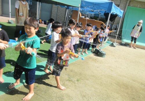 子どもたちの中には、水鉄砲名人がたくさん!そこで、オリジナルの的当て作りを行い、水鉄砲大会を開催しました♪みんなで息を揃えて、
