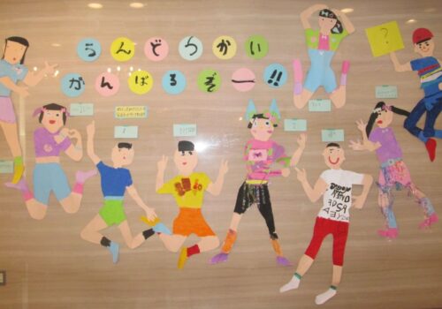 完成した 「ぼく・わたし」 は、運動会の壁面にして、玄関付近に飾りました。