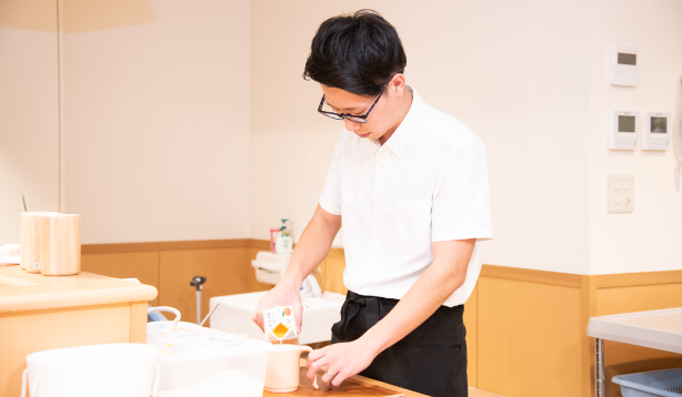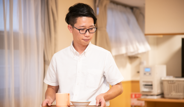 昼食の準備、食堂へ案内 利用者様の健康状態や、ご家族さまからの要望を確認しながら、お一人お一人の昼食準備をして、食堂へご案内します。