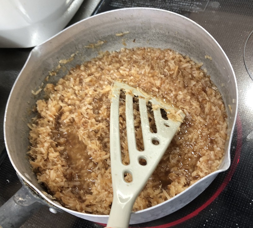 砂糖が溶けココナッツと絡み、ココナッツカラメルの出来上がり。
