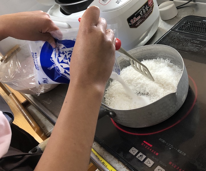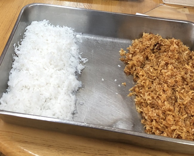 ドライココナッツを水で戻し、砂糖と一緒に煮詰めます。