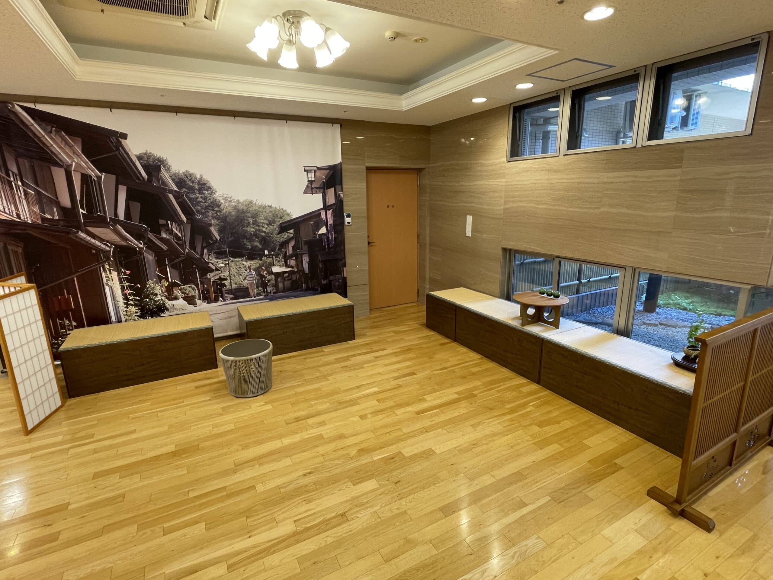 木曽では今月より玄関入ってすぐの所に休憩ができるスペースを設けさせていただきました!今まではただの通路の空きスペースでしたが、座って休める畳の設置や机を配置させていただいております。ご利用者様がちょっとした散歩の際やご面会で来られたご家族、職員が休憩できるスペースとして使用可能となりました!