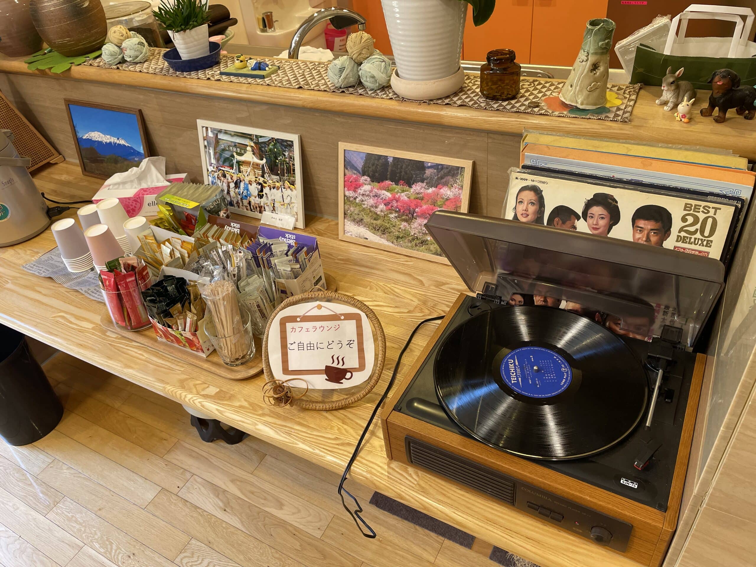 また、隣にあるラウンジには飲み物もご用意させていただいておりますので、ちょっとしたときに飲み物片手にお茶なんていかがでしょうか?レコードプレイヤーもあり使用可能です!ラウンジ横の中庭には職員が丹精込めて育てている植物たちもあり癒しの空間となっております!グレイスフル木曽に来られた際には是非ご利用ください!無料です!