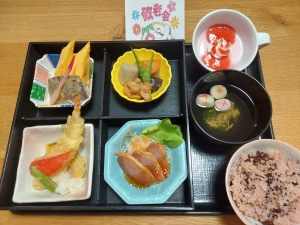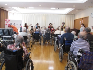 お祝いの催し物として、地域の方による「スコップ三味線」「ドジョウすくい」の演奏・鑑賞会を行いました。さらに、お食事もお祝い御膳で、とても豪華でした!!皆さんに喜んでいただくことができました!