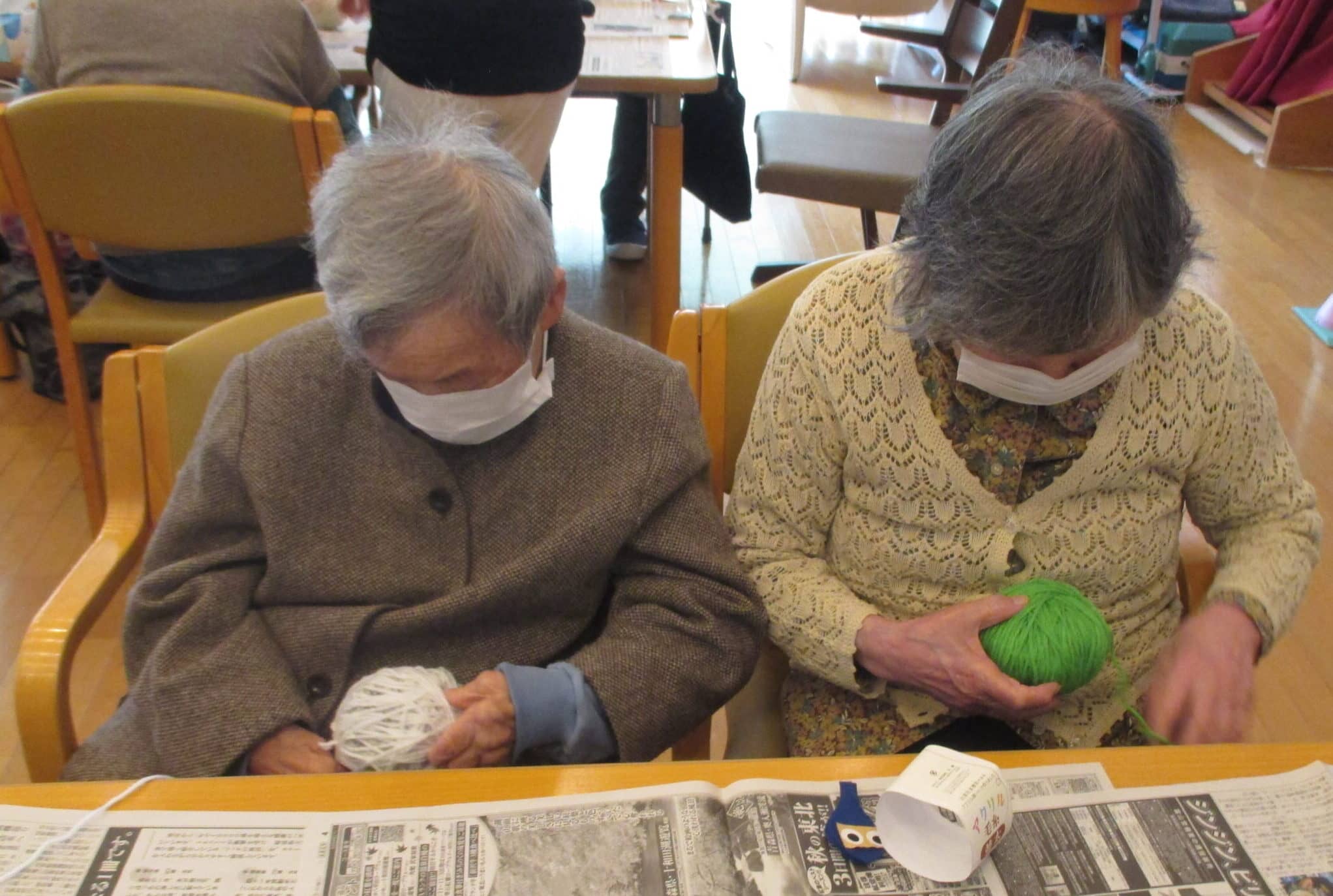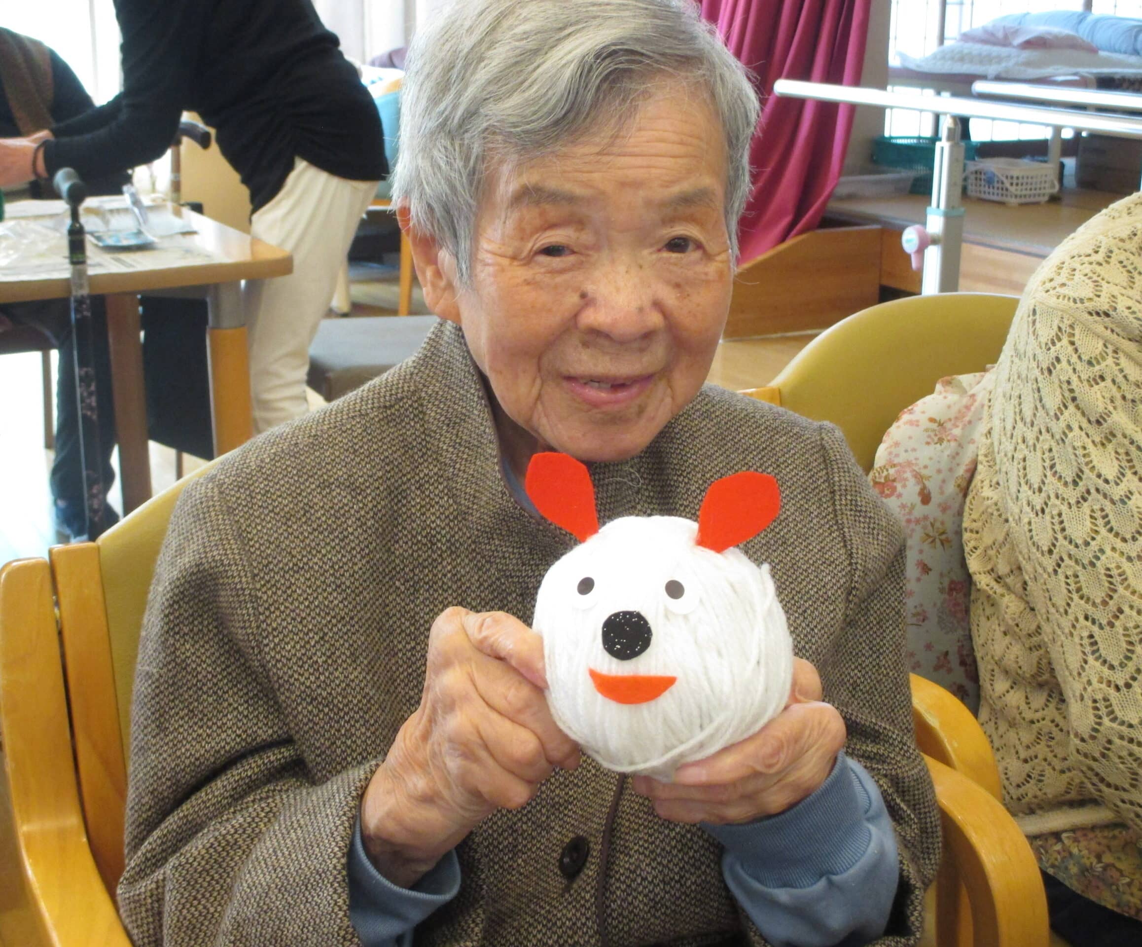 「いぶき」さんから提案頂いた作品作りは、手のりサイズの球体(中身は新聞紙を丸めているんです)に毛糸をグルグル巻きつけて、目と口と耳をつけて・・・かわいい!簡単!作り手ごとに個性のある毛糸の人形の完成です。高齢になると、摘まんだり、貼り付けたりといった動作に、手先を思うように動かせない不自由さのある方もいらっしゃいます。あるいは、どの色を選んだらいいのか、作業順番はどうしたらよいのかを迷ってしまい、手が止まってしまうという方もいらっしゃいます。そんな時、職員だけでは十分に行き届かない手助けを、ボランティアさんに協力いただき、利用者様が手伝ってもらいながら自分の作品を仕上げる満足感ももっていただけていると思います。