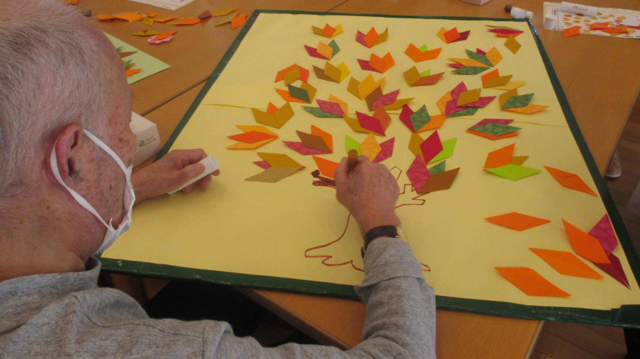 大きな紅葉の壁画制作は職員主体で企画しましたが、こちらも木曽町社会福祉協議会のボランティア担当の方を介して相談・紹介いただいた登録ボランティアの方々に、補助ボランティアのご協力をいただきました。両手をいっぱいに広げた大きさの下地各4枚へ、相談をしながら秋桜や紅葉を散りばめて貼り付け、秋らしい仕上がりとなりました。