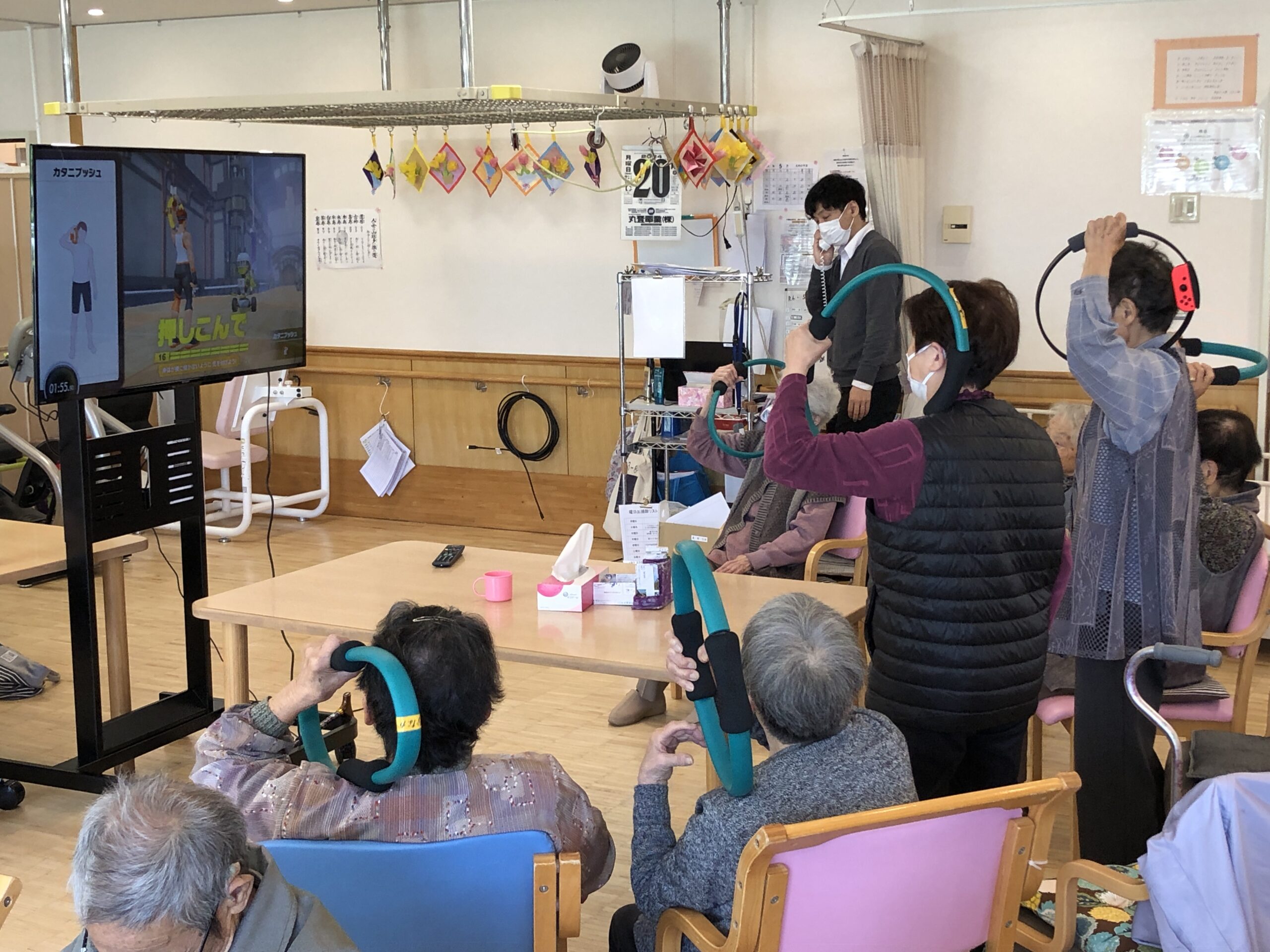職員でも、テレビゲーム?任天堂switch?を使ってどうやって運動をするのか良く分かっていなかった事(リモコンで操作では無く、リングコンで操作します)なので、利用者様でも体を動かして頂けるか不安でした。が、導入をしてみると利用者様の殆どがゲームを見ながら楽しそうに体を動かして頂いており、安心しました。