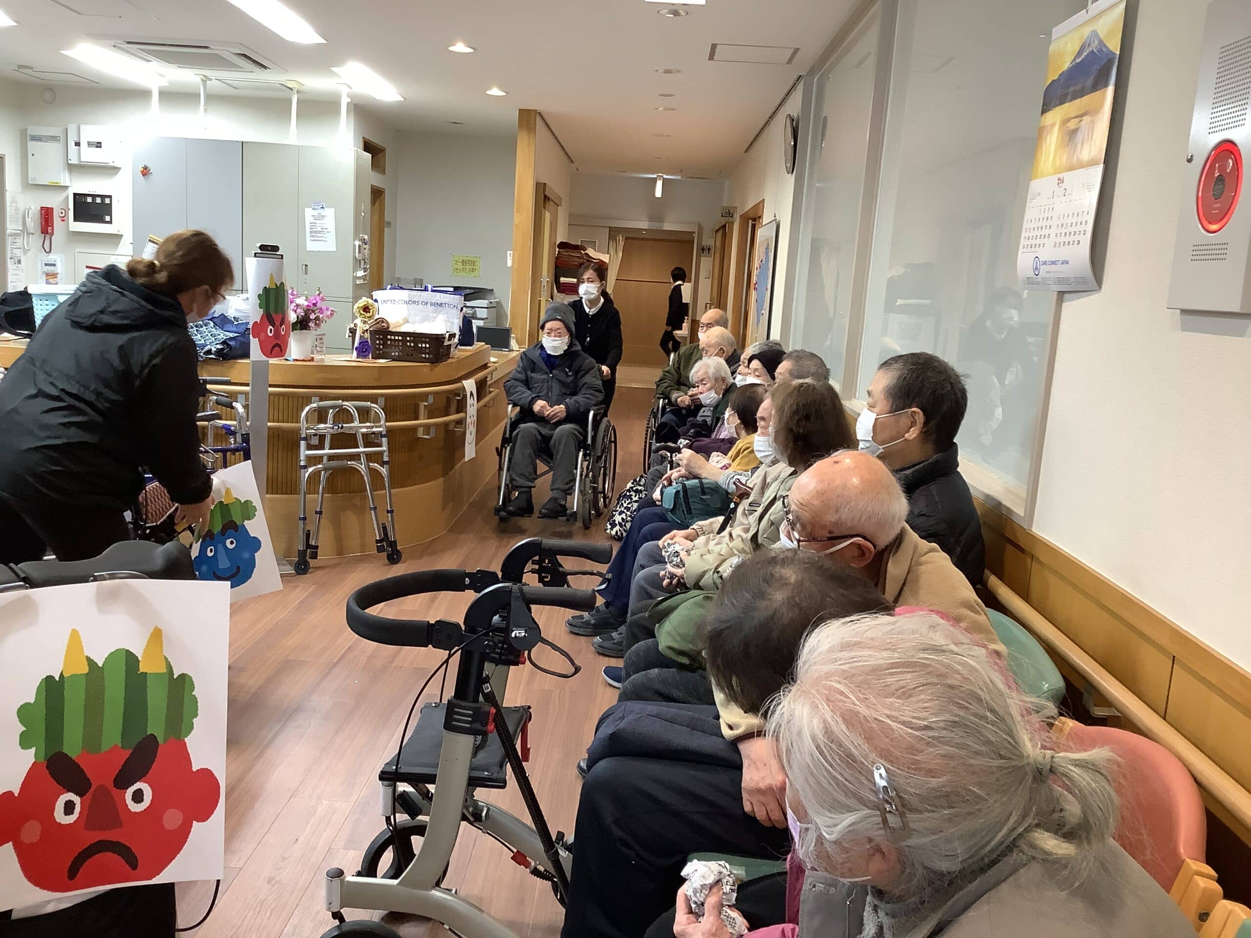 鬼の登場はありませんでしたが、鬼や福の神の的に向けて「鬼は外 福は内」と掛け声を合わせて新聞紙を丸めて作った大きな豆を皆さんでなげました!