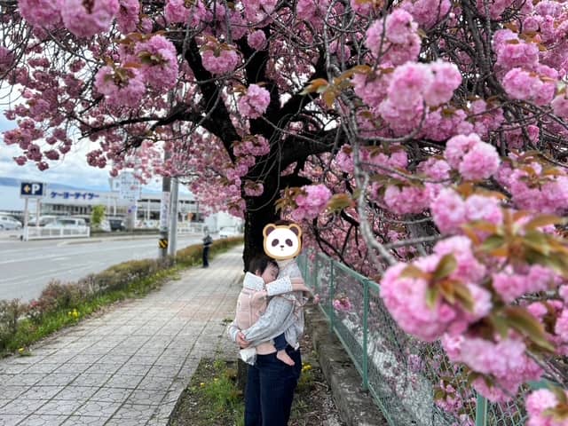 去年、岡谷に異動してきた際、5月頃に八重桜を一緒に見ましたが、まだ1歳で桜の良さが分からず暖かい陽気の中、ぐっすり寝てました(笑)