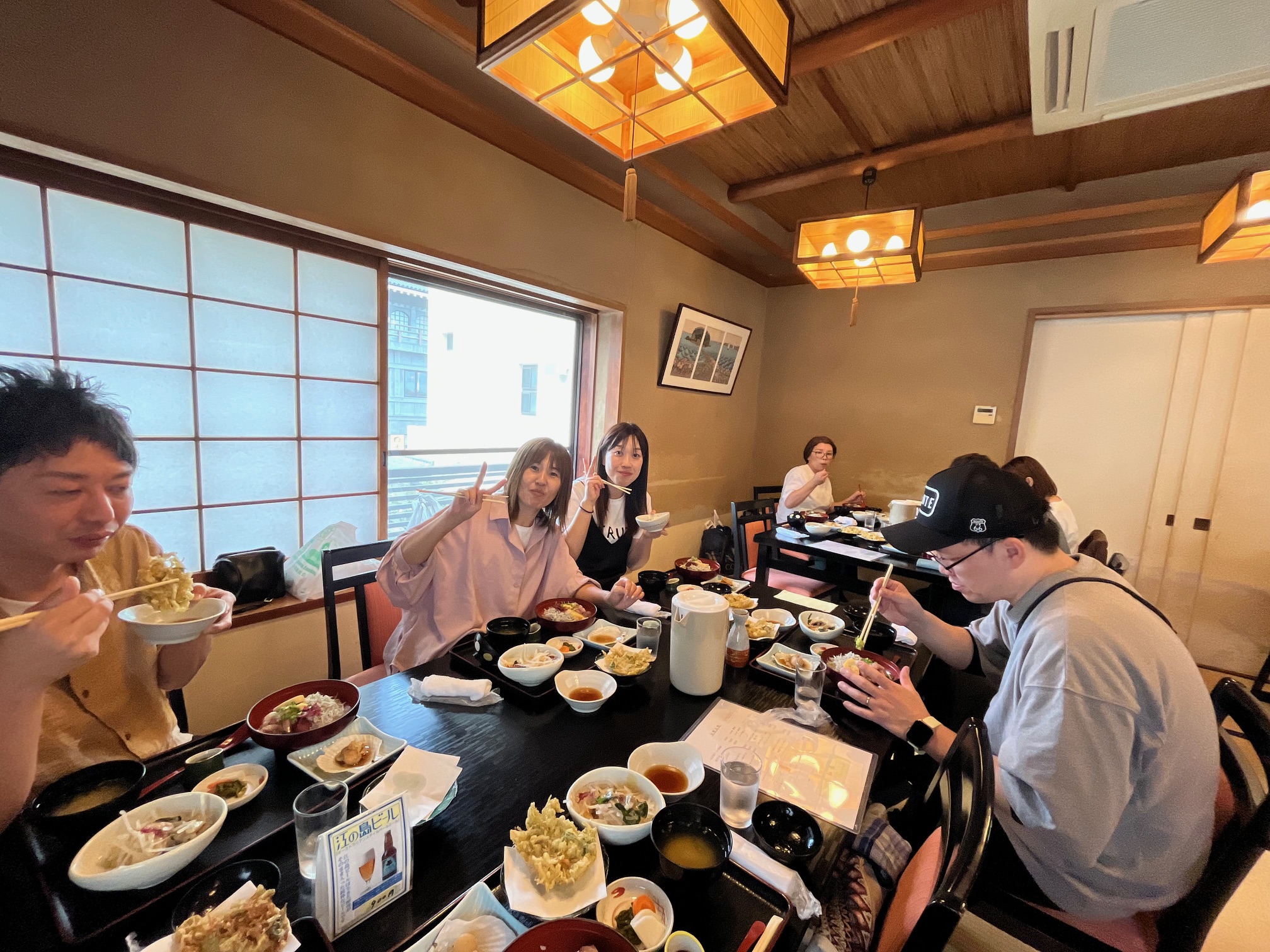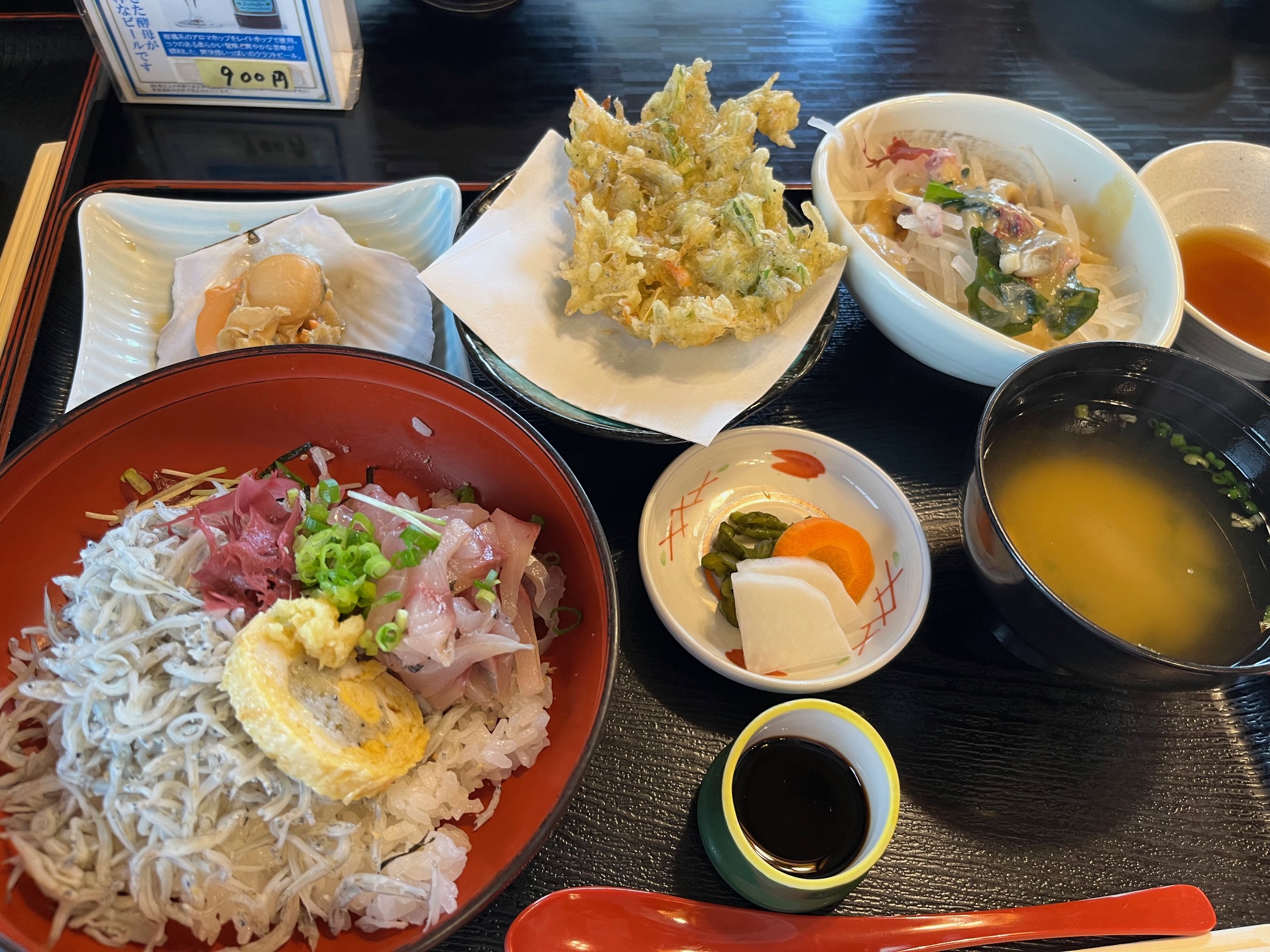 昼食は、江の島特産のアジや釜揚げしらす丼、そしてしらすのかき揚げを堪能。