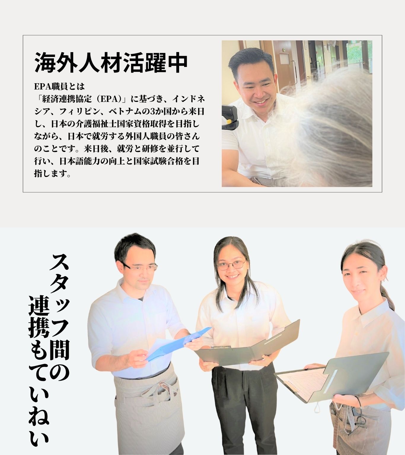 ※EPA職員とは:貿易の自由化(関税の撤廃・削減)だけでなく、投資、人の移動、知的財産の保護、サービス貿易など幅広い分野での経済関係の強化を目的とした条約で、ベトナムやフィリピンから国家資格の介護福祉士を働きながら習得されることをめざして来日される職員の皆様です。