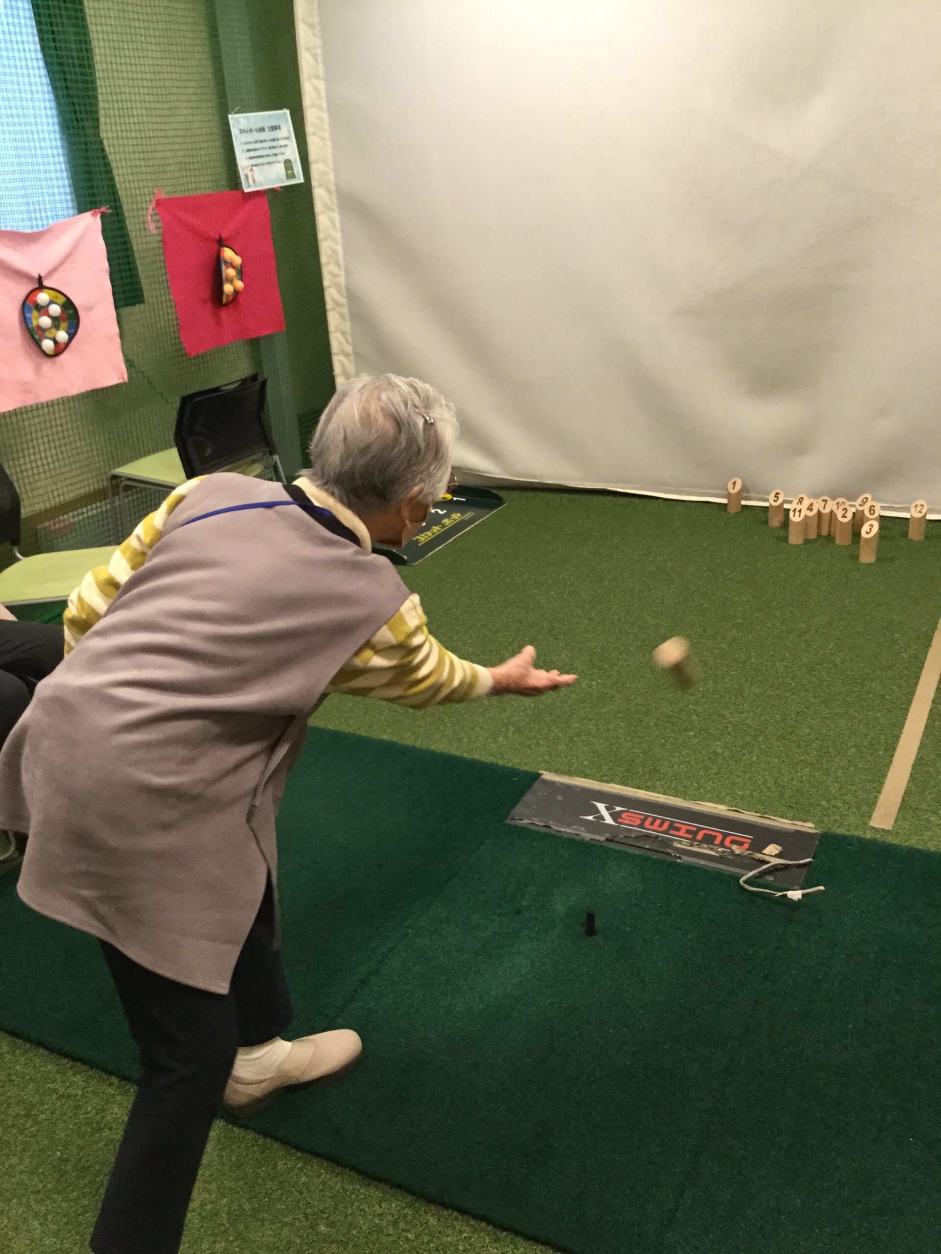 人工芝のゴルフルームで2チームに分かれて対戦し、初めての方も夢中に。