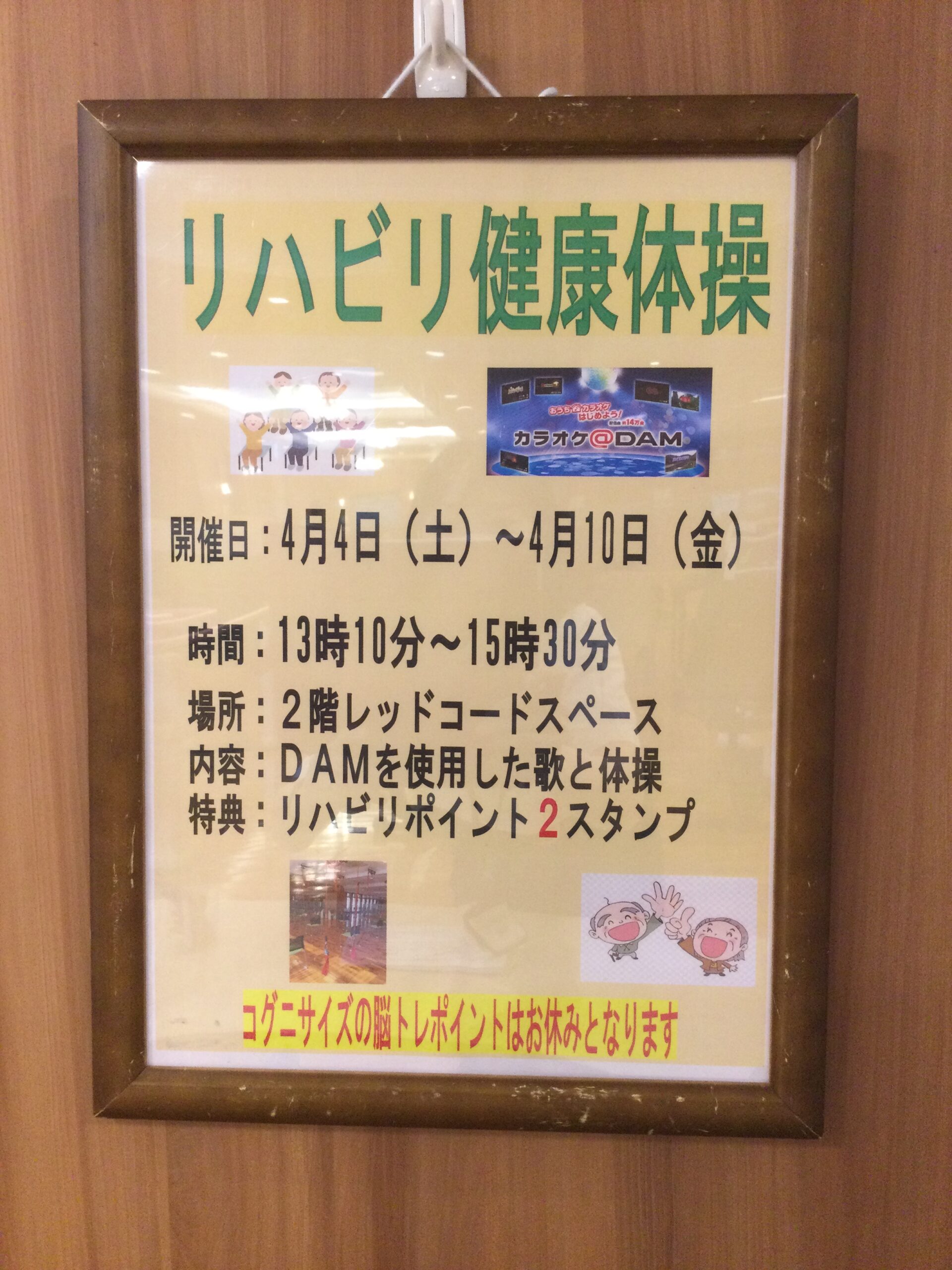 太古の湯では4月4日から10日まで、新しい企画としてDAM(カラオケ機器)を使用した歌と体操を行っています。